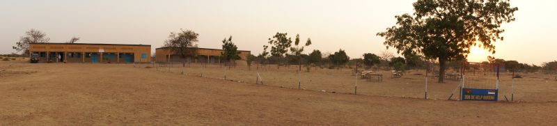 Terug naar de CEG waar inmiddels al wat meer mensen aanwezig zijn. De dorpsoudsten, die we voor onze rondgang al hadden begroet, zitten op schoolbanken op de veranda van de school in de schaduw geduldig op ons te wachten. Ook op de rest van de veranda zitten, staan of hangen nu een groep dertigplussers. Kinderen zien we eigenlijk niet bij de school. Het is natuurlijk wel vakantie en veel kinderen van de CEG komen ook van wat verder weg. De kinderen die wel in de buurt wonen, moeten zoals gebruikelijk hier helpen met allerhande karweitjes. De jongens passen op het vee en de meisjes helpen in de huishouding. Of wat in deze tijd ook nog mogelijk is dat ze moeten helpen met ploegen, zaaien en schoffelen op de velden. De directeur van de school arriveert in een Mercedes in een smetteloos wit pak, met een man die zijn tas draagt en eveneens smetteloos witte kleding draagt. Hij begroet de dorpsoudsten als eerste en daarna ons. Hij verontschuldigt zich voor zijn verlate aankomst. We knikken begrijpend. Waar wij al problemen hadden met onze four-wheel-drive zal hij dat zeker gehad hebben. Na wat beleefdheden horen we van hem dat de school prima draait. Er zijn zelfs twee klassen zes, de laagste klas op de middelbare school, opgestart afgelopen schooljaar. De school draait nu drie jaar en heeft een groep 4, groep 5 en dus twee groepen 6. Deze vier groepen passen precies in het huidige gebouw uit 2011. De financiering ervan is gerealiseerd door een Duitse stichting, die al jaren lang vele scholen bouwt in geheel Burkina. Voor volgend jaar komen ze in lokalennood en de directeur vraagt of er nogmaals geholpen kan worden. Om een volwaardig schoolgebouw te kunnen realiseren hebben ze twee extra lokalen nodig. Al pratende wordt aangegeven dat het misschien het verstandigste is als de directeur zelf contact opneemt met de vertegenwoordiger van de Duitse Stichting hier in Burkina. Hij moet hem zijn probleem voorleggen. Dat lijkt op dit moment het meeste kans te maken. Indien deze vertegenwoordiger de aanvraag in behandeling wil nemen zal hij zekere komen kijken bij het huidige gebouw. Hij zal dan beoordelen in hoeverre men goed met de gekregen zaken is omgegaan. Het schoolgebouw ziet er prima uit en ook de banken lijken nauwelijks slijtage te vertonen. Dat lijkt dus wel goed te zitten. Blijft nog een puntje over dat wij meteen zelf al constateerden en we hier nu meteen ter sprake kunnen brengen. Bij ons bezoek in 2011 zouden we 20 mangobomen planten. Het planten van bomen is een eis van de Duitse organisatie. De Stichting Help Burkina heeft het dorp toen geholpen met de aanschaf van twintig mangobomen. Het planten bleek een gigantisch karwei. In de vulkanische bodem kon men toen nauwelijks komen. Symbolisch is er toen door ons met heel veel moeite en hulp van de lokale bevolking één boom geplant. De rest is meegenomen door de directeur van de basisschool van Douré en zou later door de plaatselijke bevolking geplant gaan worden. We zien net buiten de omheining van de school maar een enkele mangoboom staan. We vragen ons af waar de rest gebleven is. Een aanwezig leerkracht van de basisschool geeft aan dat bij zijn school er mangobomen geplant zijn. Op het terrein van de CEG (middelbare school) staat een groep acacia´s. Omdat de mangobomen het hier niet zo goed doen zijn deze daarvoor in de plaats gekomen. Het schoolplein verder is redelijk schoon en de vuilnisbak op het terrein lijkt goed gebruikt te worden. Dit zullen weer pluspunten zijn. De directeur belooft zelf contact te gaan zoeken met de vertegenwoordiger van de Duitsers. Via de mail zal met de stichting contact gehouden worden hierover.